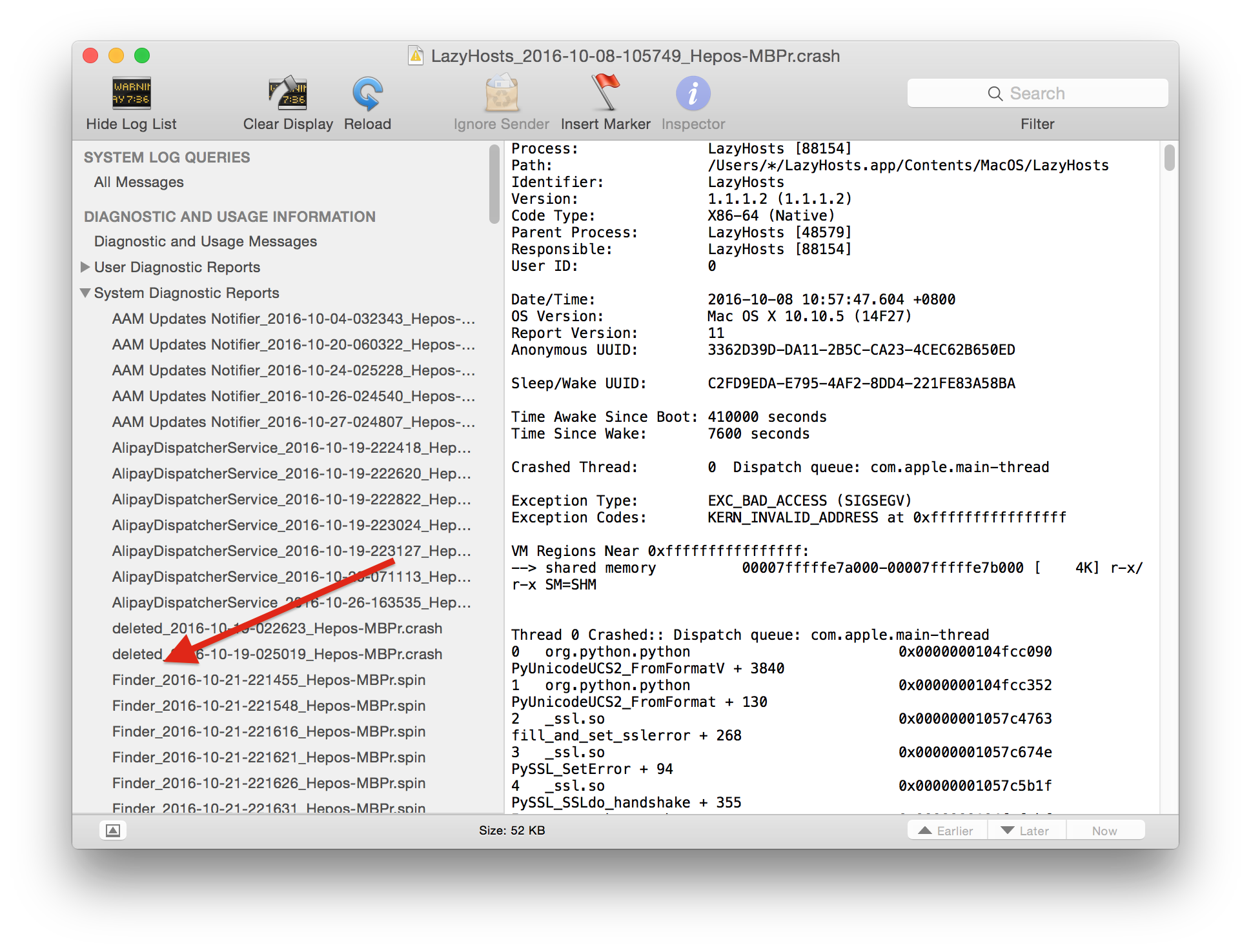在App启动时的错误,或者直接crash,Mac系统会自动收集一份错误日志。这份日志,有时也能起到辅助的作用。